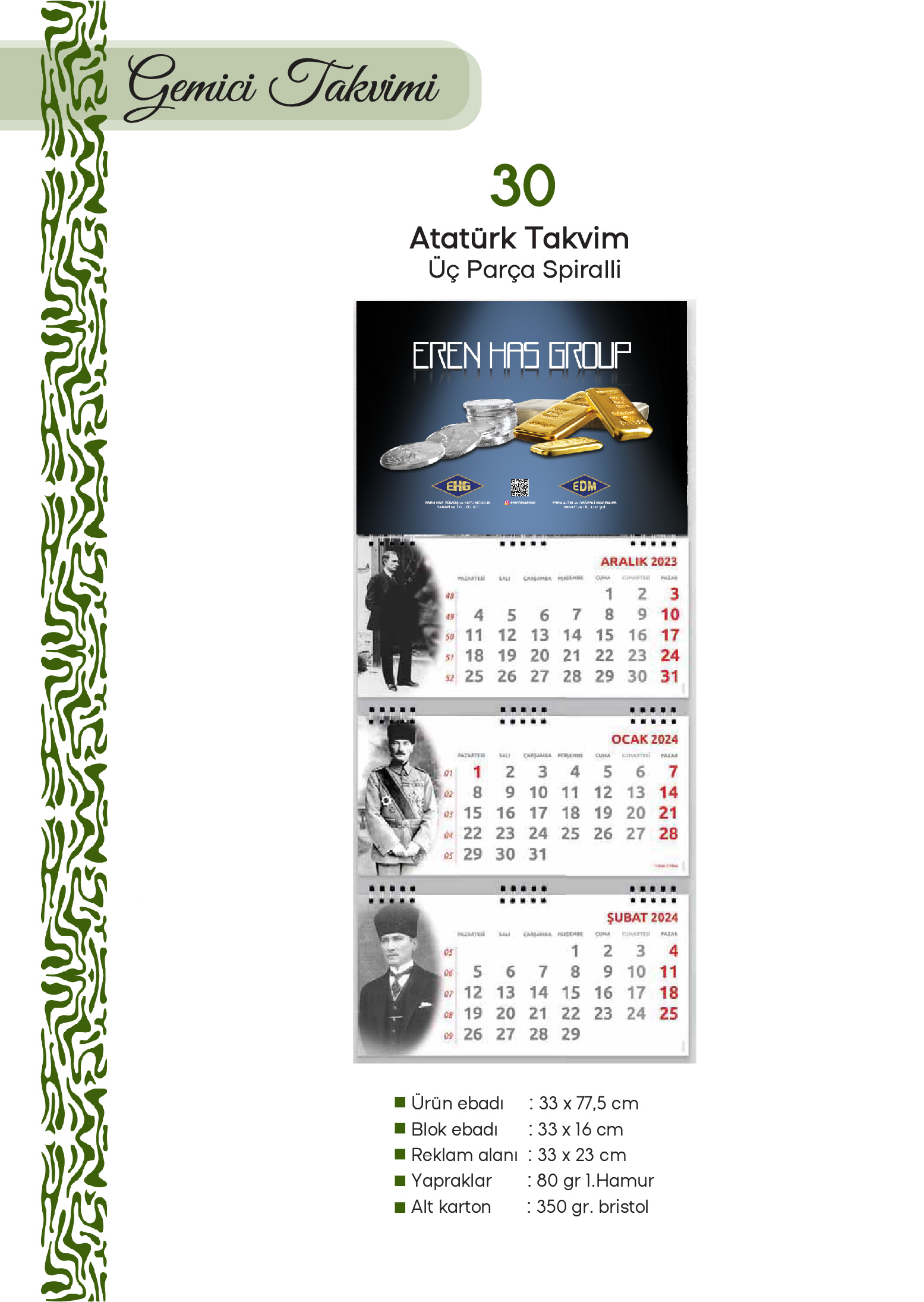30 - Atatürk Gemici Takvim (Üç Parça Spiralli)